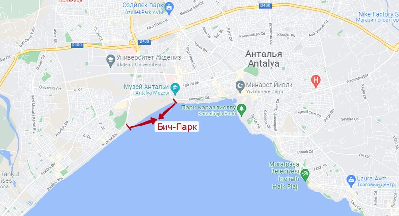 Если отвечать на вопрос, на каком пляже Антальи есть лежаки на протяжении всей береговой линии, то это Бич-Парк — побережье разделено между клубами, которые в высокий сезон устанавливают здесь пляжное оборудование (аренда шезлонга — от 20 лир). Среди других объектов инфраструктуры на территории Бич-Парка есть раздевалки, душевые, туалеты. Пляжная зона оборудована пандусами.