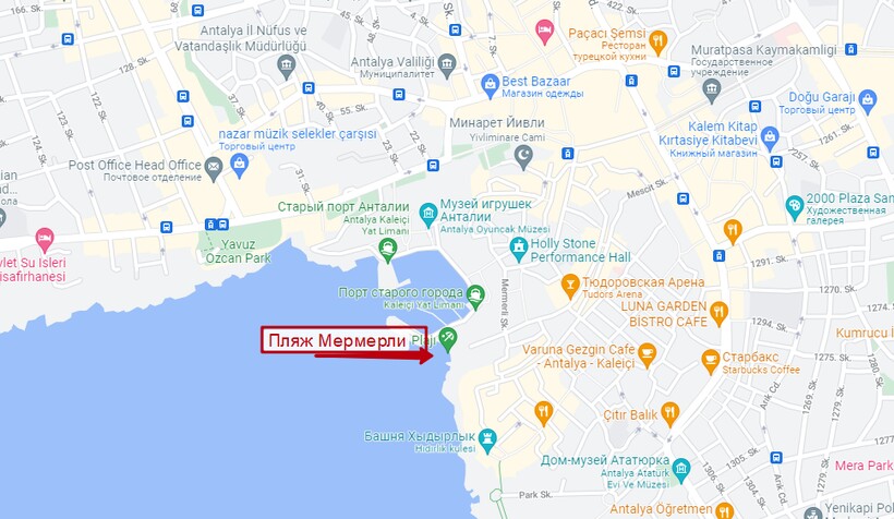 Найти лучшие пляжи в Антальи с белым песком не получится, но, кроме Лары, из песчаных участков побережья популярностью у туристов пользуется Мермерли. Эта пляжная зона является одной из первых, появившихся в Антальи. Она расположена прямо в центре курорта, недалеко от Старого города Калеичи.