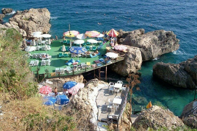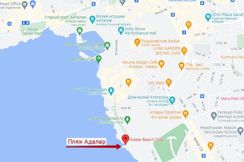 Среди фото города Анталья и его пляжей часто попадается клубный пляж Адалар, расположенный в тихой бухте в исторической части курорта (рядом с парком Караалиоглу).