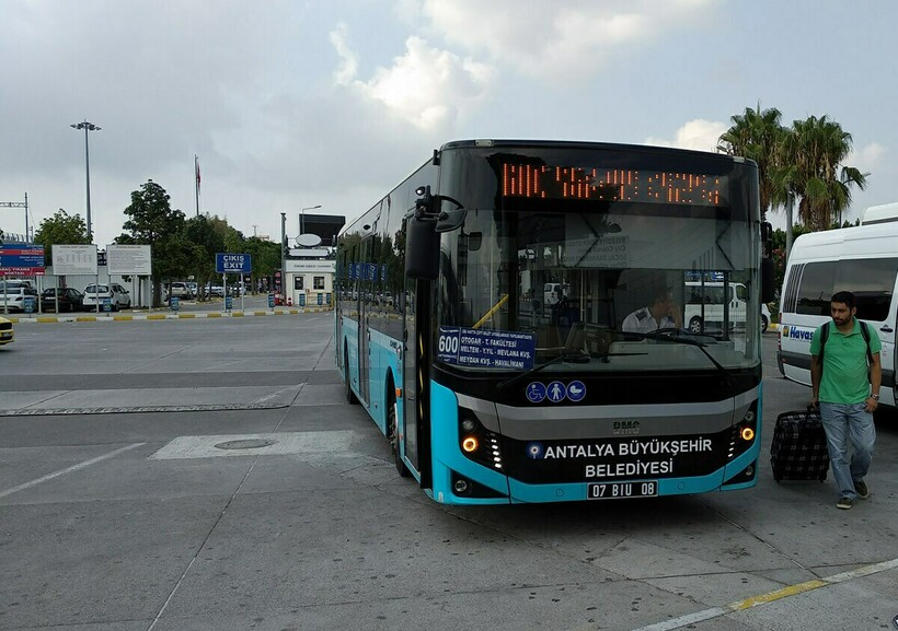 До главного автовокзала Антальи (Antalya Otogar) курсирует автобус № 600. Рейсы осуществляются с 6 утра до полуночи, интервал движения составляет — 30 минут. В ночное время есть два рейса — в 01:45 и 03:45. Автобус отправляется со стоянки рядом с терминалом № 3 и делает остановку около терминала № 1. С автостанции города в аэропорт Турции Анталья добраться можно с 06:00 до 23:30, ночью выезды — в 02:30 и 04:45.