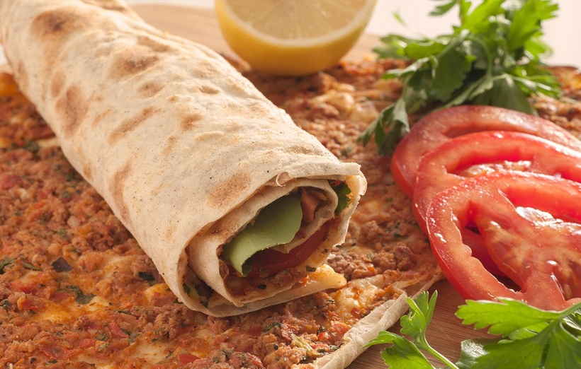 - Лахмаджун. Это большая лепешка, помазанная специальным соусом, сверху положены овощи, мясной фарш, зелень и специи. Чем-то похожа на пиццу. Ее сворачивают в виде трубочки и едят. В вегетарианском варианте роль мяса выполняет творог.