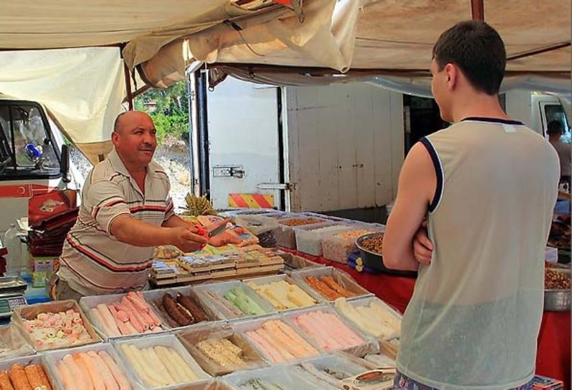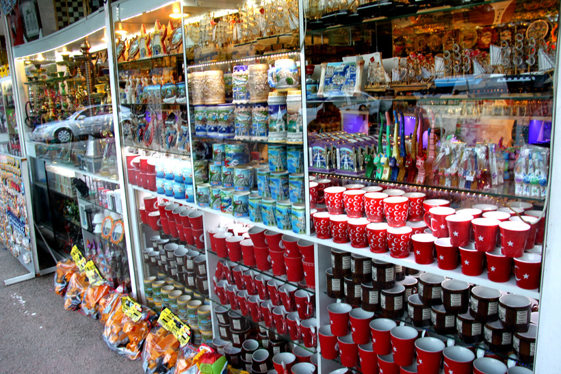 Цены на товары вполне доступные, но торговцы стараются извлечь выгоду из всего. Как и везде в Турции, чтобы купить вещи по выгодной цене, здесь нужно обязательно торговаться с продавцами — так же, как на простом базаре. Это позволяет снизить цену практически вдвое. Многие торговые точки принимают карты для расчета, но турки больше любят наличные деньги, пусть даже рубли. Правда, в этом случае курс обмена будет не в пользу покупателей, поэтому, на мой взгляд, лучше рассчитываться евро и долларами.