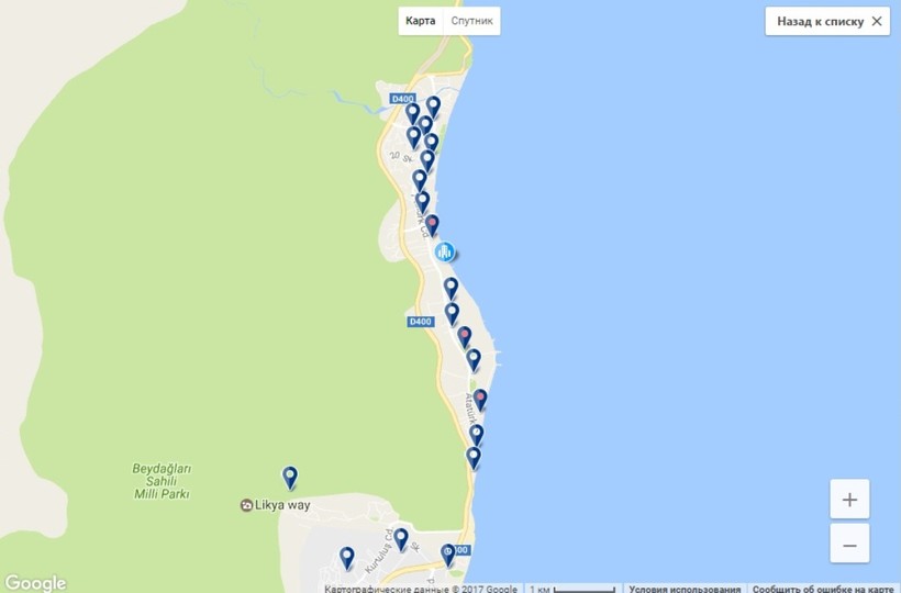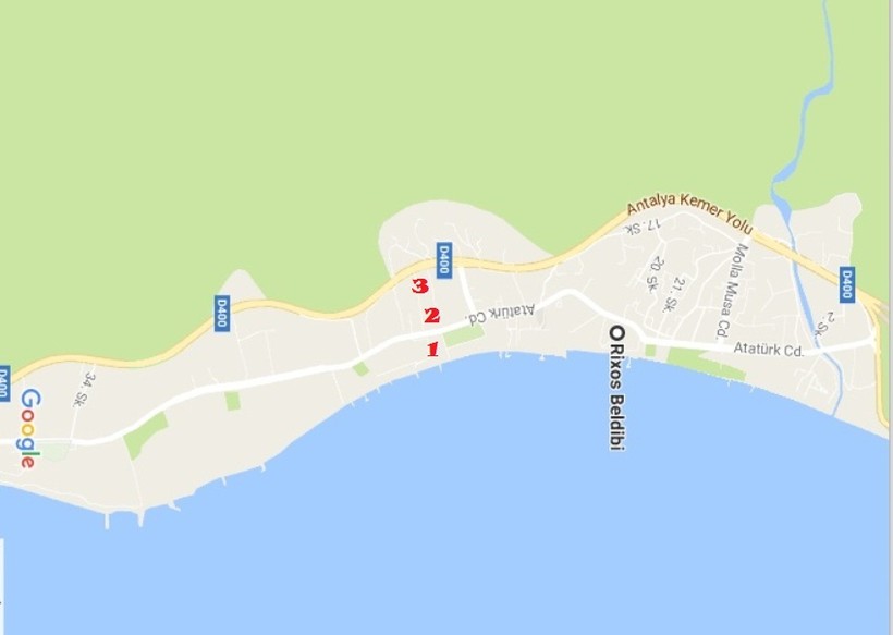 - 2 район, соответствующий второй пляжной линии, находится на левой стороне главной улицы Ататюрка (если повернуться по направлению к Анталии). На карте она обозначена, как Ataturk Cd. Цены на проживание здесь немного ниже, да и до магазина идти ближе, поэтому места в отелях этого района нужно бронировать заранее — они пользуются повышенным спросом.