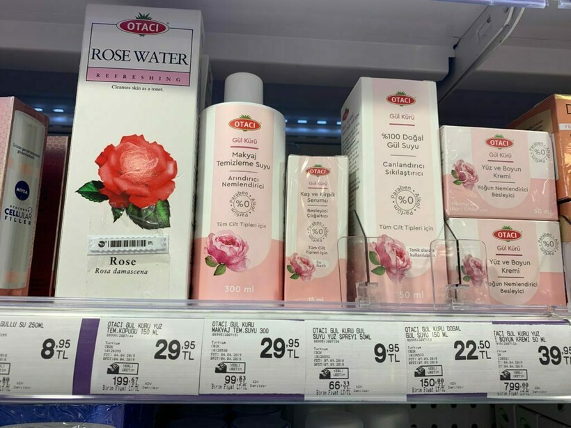 розовую воду (ROSENSE, OTACI), стоимость — от 10–20 ₺ (85–170 ₽) за флакон;