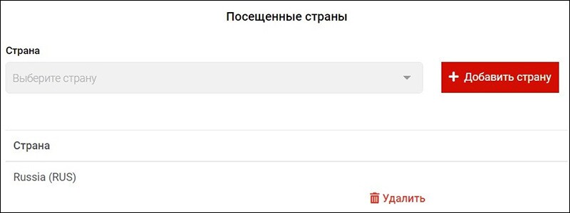 Здесь лишь один пункт «Страна», где нужно выбрать из выпадающего списка те страны, в которых вы побывали до приезда на турецкий курорт. Обратите внимание, что после выбора позиции из списка нужно нажать на кнопку «+ Добавить страну», а лишь затем переходить к четвертому шагу.