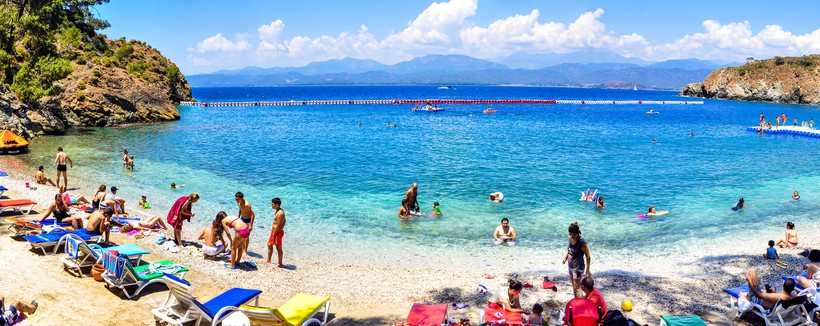 - Пляж заповедника в Олюденизе (пляж Олюдениз) – платный пляж, доступен для всех гостей заповедника. Вход в него стоит 4 TRY с человека. В эту стоимость входит пользование шезлонгами в течение всего дня на одного человека, а также доступ к заповедному озеру, всем уголкам заповедника. Это и есть тот пляж, который рекламирует курорты Фетхие и Олюдениз по всему миру.