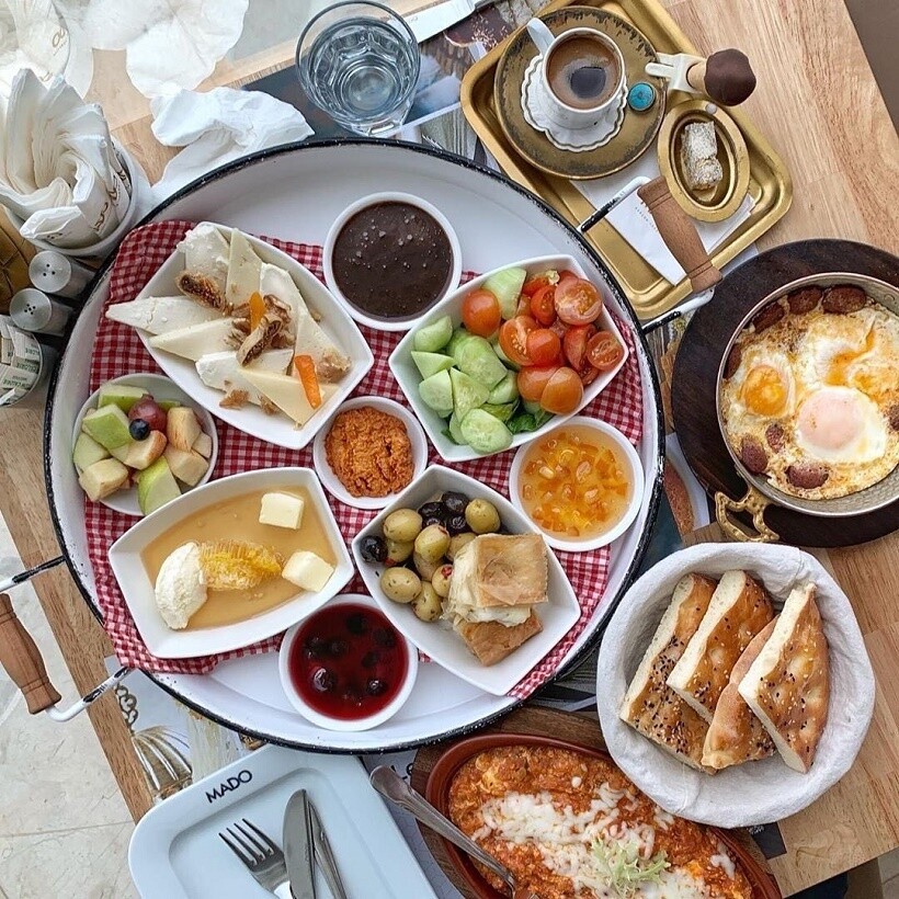 - Утром может быть предложен турецкий завтрак или вариант, поданный на одной тарелке. Блюдо называют Kahvaltı tabağı и в составе его будут овощи, сыр, яйцо, сосиска. В придачу вы получите хлеб или симит, а также мед или варенье. Такой завтрак в кафе можно брать на двоих (порция достаточно большая), и обойдется это примерно в 20–40 турецких лир, что в российской валюте составит 170–350 рублей.