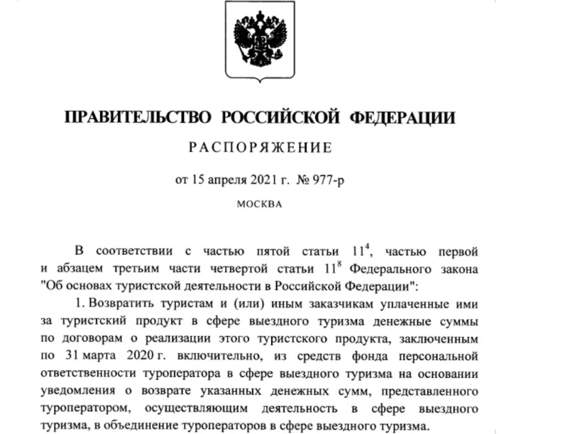 Возврат денег за туры до 31 марта 2020 года (то есть за путёвки, оформленные до 31 марта 2020 г.) упоминается и в свежем Распоряжении Председателя Правительства № 977-р от 15 апреля 2021 г. По сути апрельский документ говорит о том, что туроператоры вправе брать деньги из фонда персональной ответственности, чтобы возвращать их туристам, но не обязывает их делать это немедленно.
