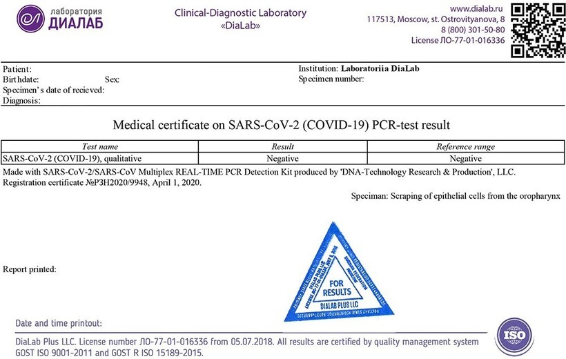 - в документе указывается наименование лаборатории, метод исследования (PCR или RAT) и прописывается результат теста Negative (отрицательный).