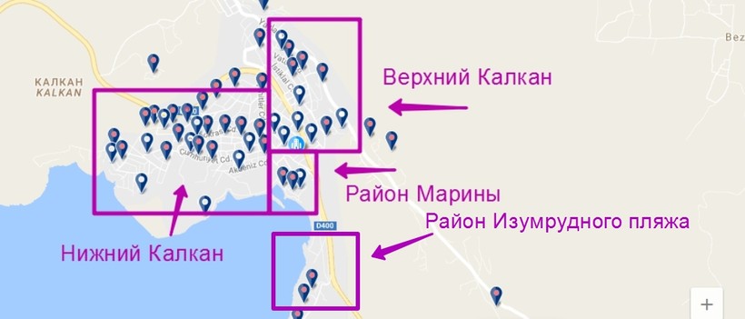 В Калкане существует центр с сильным перепадом высот, где находятся все главные лавочки и магазины. По сути, это группа улиц вокруг пути с пляжа в отель и обратно. Ниже на карте я отметила данную зону с четырех сторон звездочками.