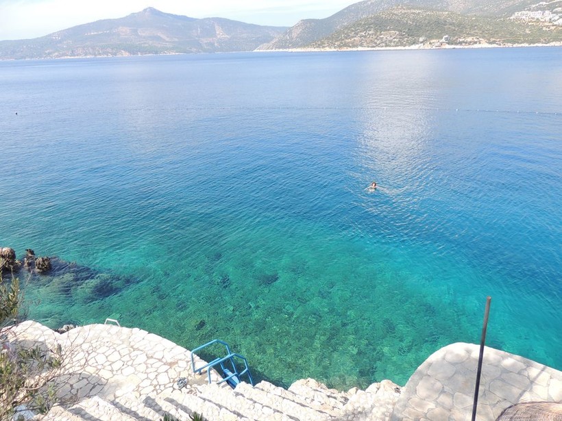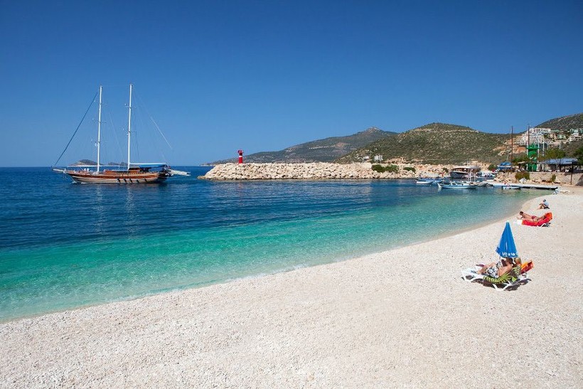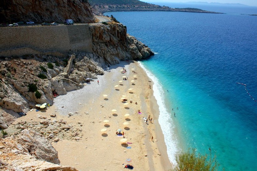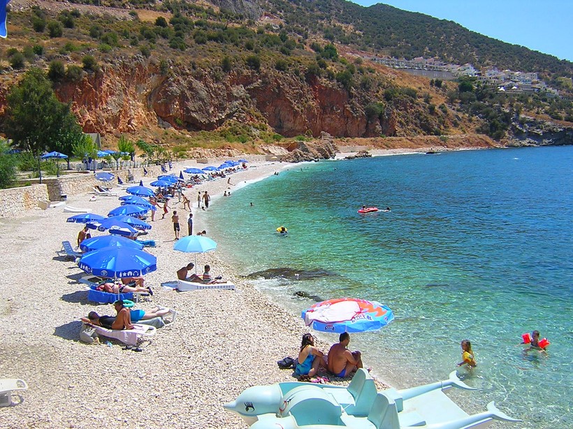 - Пляж Капуташ (Kaputaş Plajı). Шезлонги: да, 5 USD в день. На пляже часто бывают волны, но достаточно маленькие для игр и купания с детьми. Стоить учитывать, что на пляже есть и душ, и раздевалки, и туалет, поэтому вы можете спокойно приезжать сюда из Калкана на весь день. Рестораны, еда: есть маленькое кафе. Пляж очень чистый, его постоянно убирают, вода в море чистейшая. Обычно здесь очень много туристов, но пляж того стоит! Обязателен к посещению!