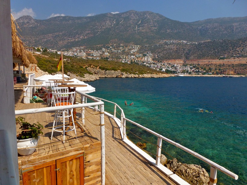 - Aubergine Restaurant – шикарный ресторан на террасе, нависающей над морем! Время работы: с 9 утра до 2 ночи. Средний чек за обед – от 15-20 USD за ужин на одного. Полный адрес: Yaliboyu Mah. Kalkan harbour, Kalkan Mahallesi, No:25. Ниже я поставила фотографию этот ресторана: