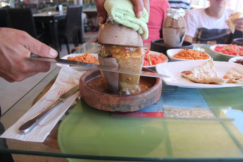 Настоящая гастрономическая достопримечательность Каппадокии – это "тести кебаб", или его ещё называют "потыри кебаб". В самом начале я писала, что кебабов в Турции столько, сколько городов, и не соврала. Каппадокийский кебаб готовится в тандыре в глиняном горшке, который разбивают пополам большим ножом на ваших глазах уже на столе. Это баранина с овощами, из блюда течёт сок, который остаётся в каемке горшка и в него можно макать свежайшим хлебом. Это настоящая сытная каппадокийская еда, подаётся почти во всех кафе и ресторанах. Здесь очень любят баклажаны в разных вариантах (это мой любимый овощ, только ради него я могу возвращаться в Каппадокию снова и снова). Соления, варенья, маринады, всё это в огромном количестве присутствует в домашней кухне.