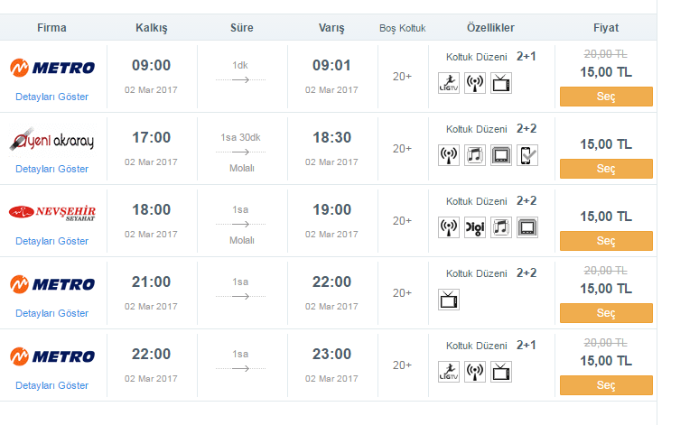 Ниже список автобусных рейсов из Кайсери в Гёреме на произвольную дату. Как видите рейсов много, но всё же не каждый полчаса, как метро.