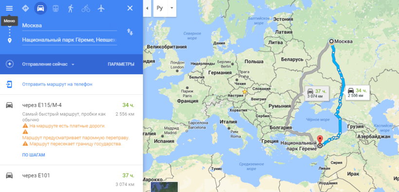 Как видите, нас с каппадокийцами разделяет Чёрное море, поэтому на машине его нужно либо объезжать, либо делать паромную переправу. Мне кажется, в этой поездке вы успеете обдумать все философские вопросы, которые волнуют человечество – настолько долгой она будет. В конце концов, решите, что вся наша жизнь – это бесконечный поиск своего места в мире, который никогда не заканчивается, как и дороги. В общем, по пути из Москвы или Санкт-Петербурга в Каппадокию вы можете превратиться в Джима Джармуша и снять своё медленное и красивое роуд-муви. Я вас предупредила :)