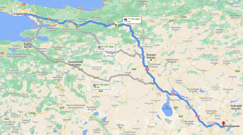 Стамбул и Каппадокия находится довольно далеко друг от друга. По прямой между городами 566 км. Если ехать на машине, расстояние Стамбул — Каппадокия по автобанам составляет около 785 км. Путешествуя наземным транспортом, готовьтесь потратить от 9 часов, воздушным — чуть больше, чем 1,5 часа.