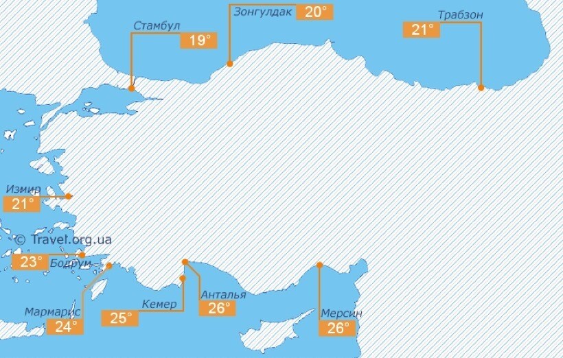 В этих районах средняя температура воды составляет около +23 °С. Рассматривать курорты Эгейского моря для отдыха на пляже мы не рекомендуем — там купаться уже не получится, вода остывает до плюс 20°С.