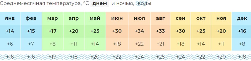 В сентябре летняя жара немного идет на спад, но и такая погода комфортна для пляжного отдыха: температура днем сохраняется в пределах +27–30 °C, вода в море теплая — +22–24 °C.