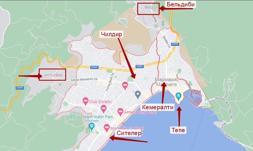 Официально территория города на двух морях разделена на 8 курортных зон. Сам Мармарис включает следующие районы: