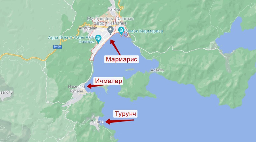 Кроме городских районов, в курорты Мармариса включены и близлежащие поселки Ичмелер и Турунч.