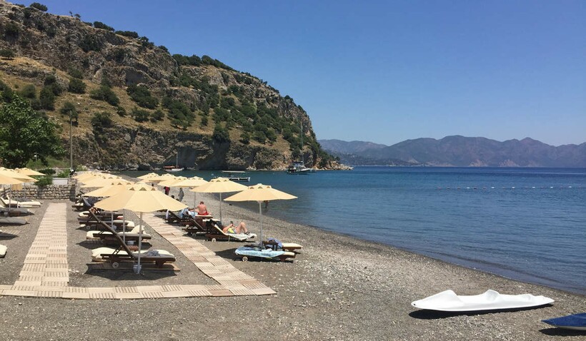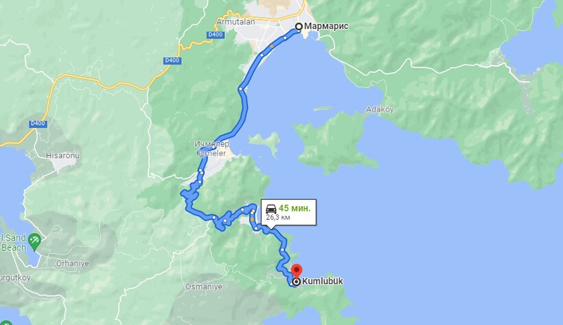 В 25 км к югу от Мармариса расположился уютный мелкогалечный пляж Кумлубук. Этот участок побережья подойдет для уединенного отдыха — поселок только застраивается, объектов размещения здесь немного, поэтому пляжная зона даже в высокий сезон немноголюдная. Вход в море пологий, но покрыт галькой, благодаря чему вода очень чистая — дно просматривается даже на расстоянии в 5 м от берега.