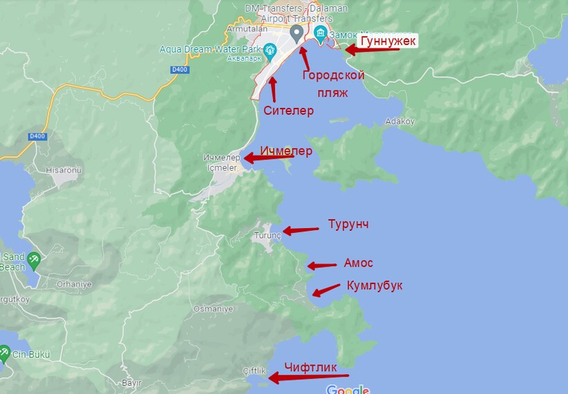 Самые лучшие пляжи Мармариса (Турция) расположились на карте курорта следующим образом (с востока на юго-запад):