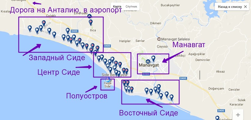 Я также составила карту пляжей Сиде, чтобы вам было удобнее: