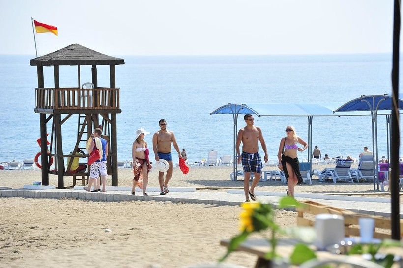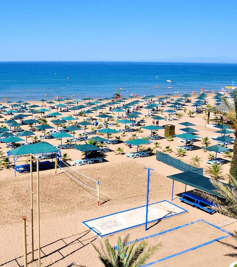 - Пляж Кумкёй (Kumkoy Beach). Плюсы пляжа: веселая семейная атмосфера, возможность играть в пляжный волейбол (аренда мяча и сетки), окружение из дорогих отелей и близость города.