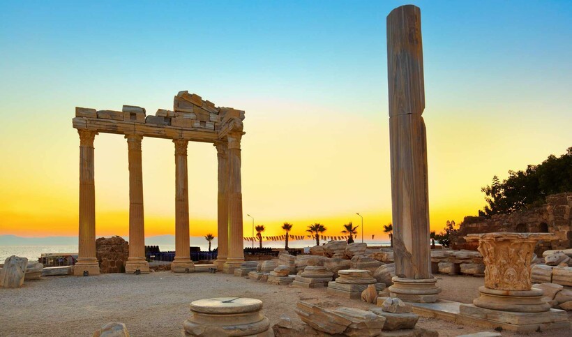 Со времен расцвета Сиде остались руины античных храмов. Знаменитая достопримечательность города — восстановленные пять колонн и фронтон храма Аполлона, рядом находятся руины храма Афины и Артемиды. Когда-то они составляли единый комплекс. Достопримечательность находится в некотором отдалении от маршрутов городских автобусов, в юго-западной части гавани. Удобнее добраться на такси или с обзорной экскурсией, можно и пешком.