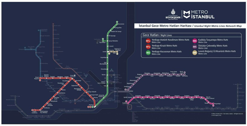 Метрополитен в Стамбуле начинает свою работу в 06:00, кроме зеленой ветки М2, поезда которой выезжают в 06:15. В полночь станции закрываются.