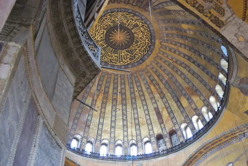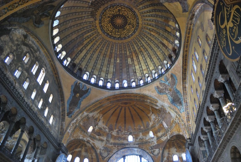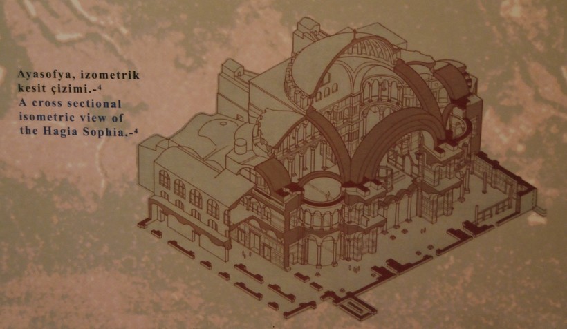 Оказывается, то, что для нашего взгляда сегодня привычно и не вызывает особого удивления, берет начало полторы тысячи лет назад, а тогда это было принципиально новым словом в строительстве храмов. Например, «паруса» — сферические треугольники, заполняющие межарочное пространство (они же передают нагрузку мощного купола на пилоны, а примыкающие полукупола обеспечивают стабильность и устойчивость), каскады куполов сочетают в себе как смысловую нагрузку, так и эмоциональную, а также являются решением для особого проникновения света в помещение (на фото ниже).