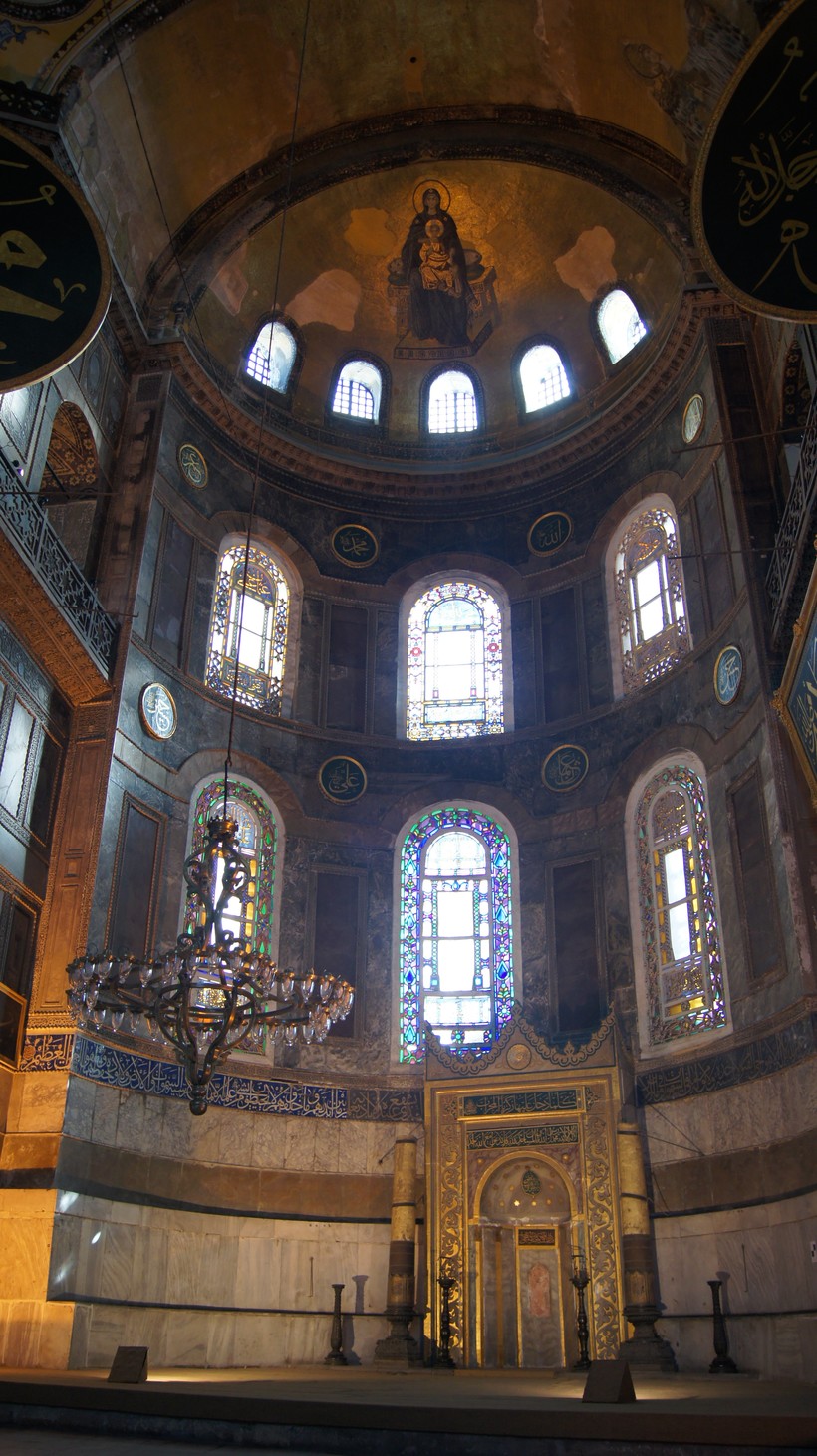 В первую очередь к собору пристроили минареты (сначала два наспех при Мехмеде II, затем еще два — при Селиме II и Беязиде II) и заштукатурили мозаики и фрески, в юго-восточную часть храма поместили михраб.