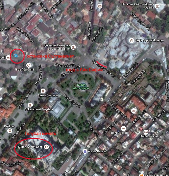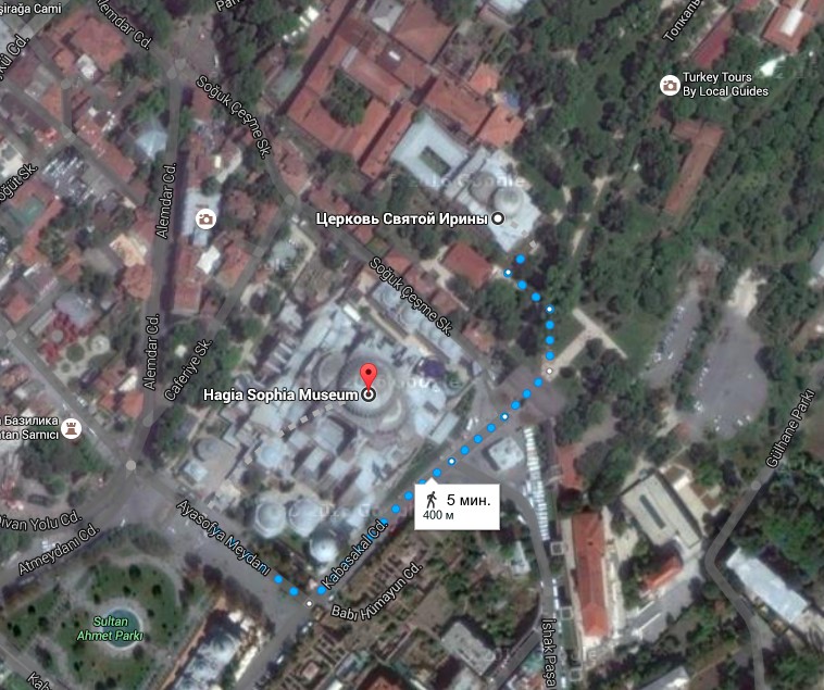 Выйдя из трамвая, вы окажетесь точно напротив мечети, а слева от нее примерно в пятистах метрах находится Айя-София. Ее трудно не заметить.