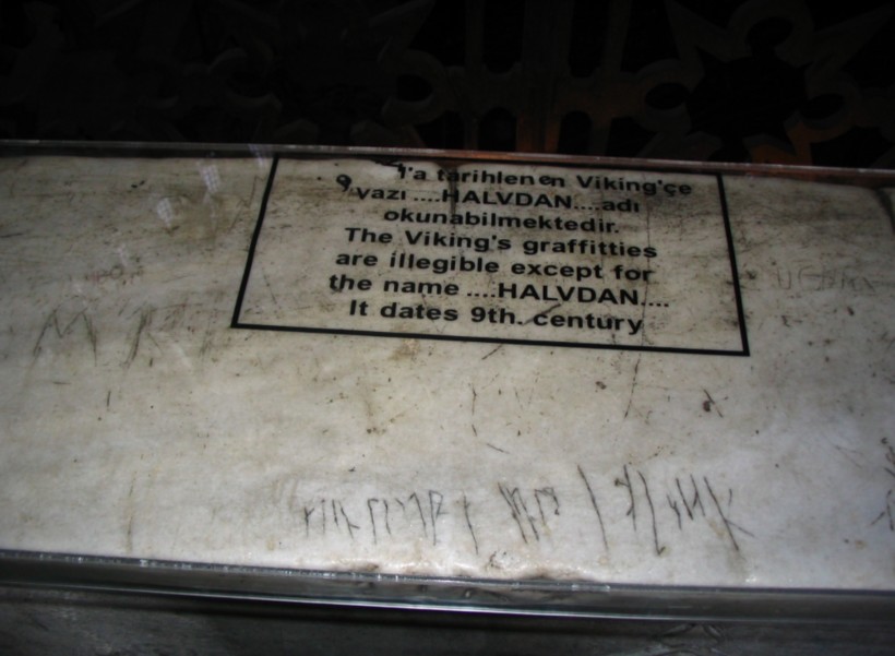 Проходя по северной галерее, подойдите к перилам и попробуйте найти на них «граффити» (в переводе с итальянского это слово обозначает «царапины»). Это вовсе не «хулиганство» наших современников, это скандинавские руны — следы, которые в IX веке оставили варяжские воины, видимо, хотели увековечить память о себе.