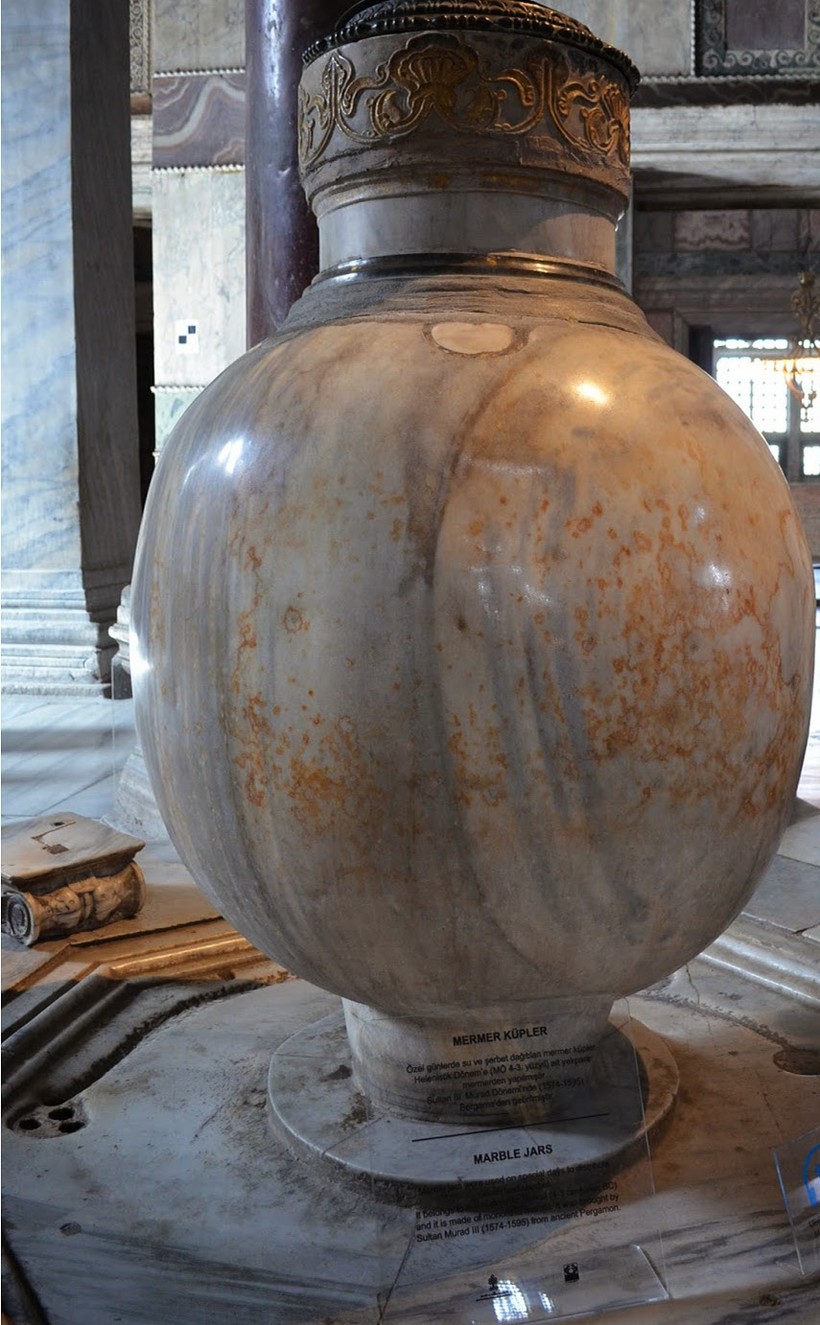Они были привезены в Собор из Бергамо в конце 16 века в период правления Мурада III и использовались для хранения воды — около 1250 литров в каждой.