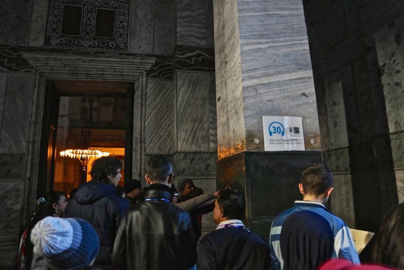 Находясь на нижнем уровне храма, обратите внимание на омфалион — место коронации императоров Византии.