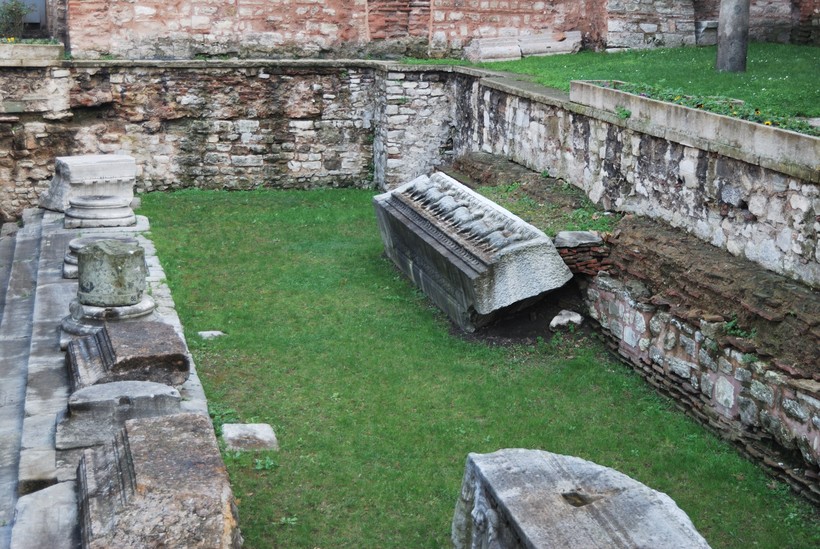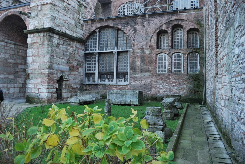 Начать осмотр музея можно с западного сада, в котором собраны остатки колонн и другие фрагменты первых двух церквей, найденные в ходе раскопок, проводимых Стамбульским Институтом археологии.