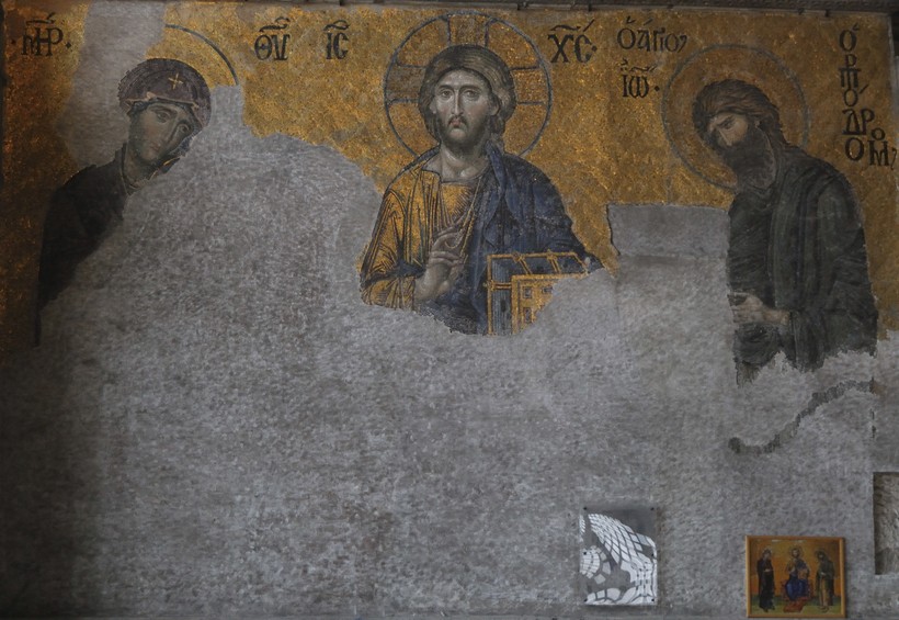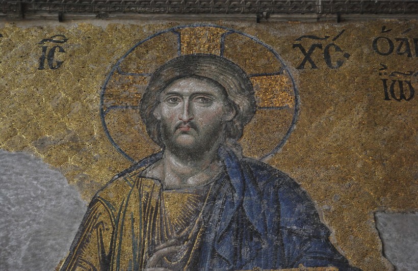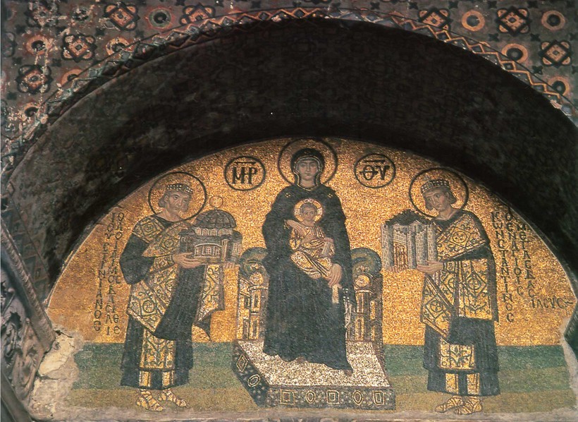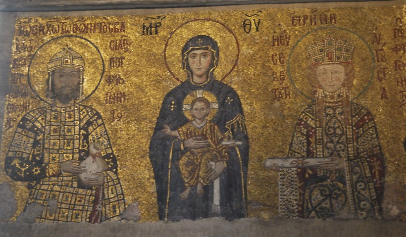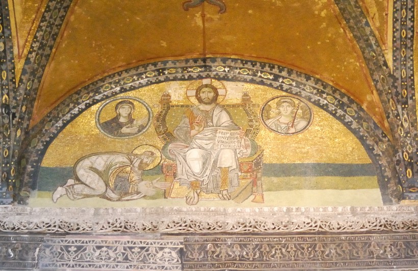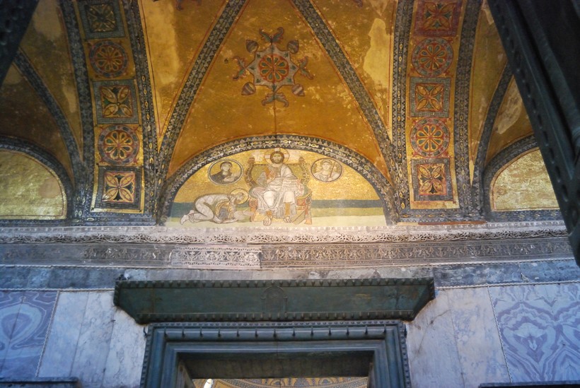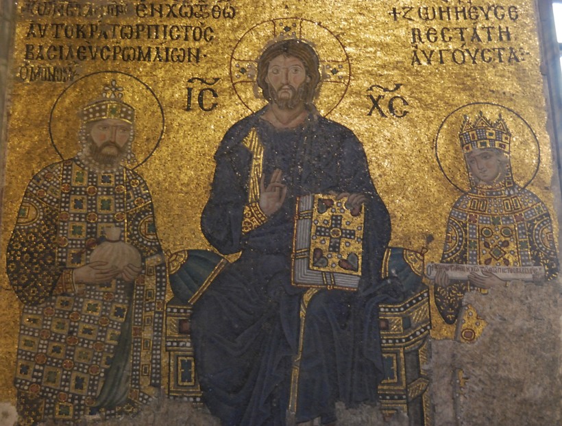 На мозаике южной галереи — Христос на троне, а Константин Мономах и императрица Зоя подносят дары