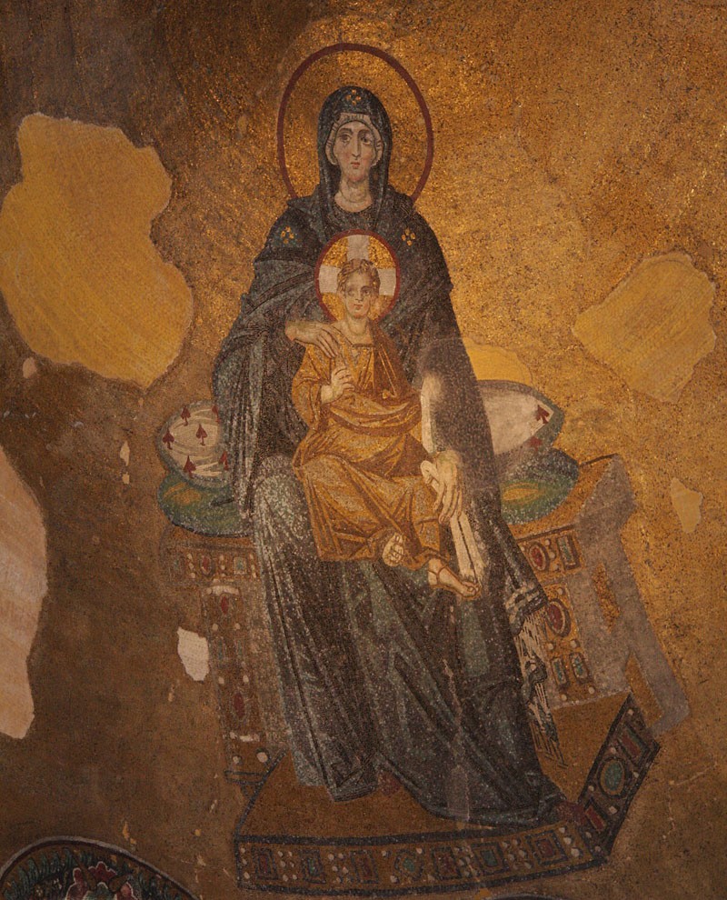 На мозаике люнеты (часть стены, выраженная аркой и располагающаяся над дверью или окном) над дверью из южного вестибюля в нарфик изображена Богоматерь с младенцем и два великих византийских императора — Константин и Юстиниан (вторая половина Х века).