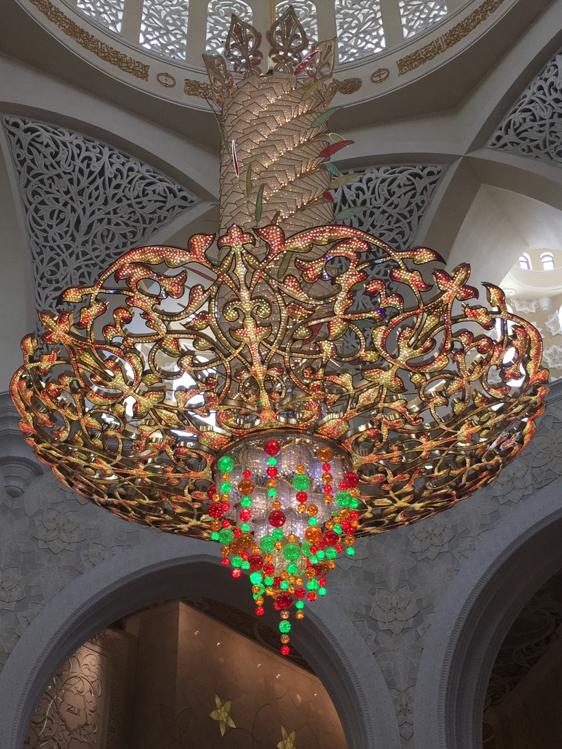 Еще одну строчку в книге рекордов Гиннеса занимает ковер. Изготовлен он компанией «Ковры Ирана» и доставлен на двух самолетах в Абу Даби. Эскиз рисунка был нарисован художником Али Халики. Основной цвет выбран зеленый, важный в исламской религии. Площадь покрытия составляет 5627 квадратных метров, а вес — 47 тонн. В эти цифры сложно поверить, но это факт. Над ковром работала большая команда, в которую вошло 1200 ткачей, 20 технических групп и 30 рабочих. Материалы использовали только натуральные и самого высокого качества — хлопок (12 тонн) и шерсть (35 тонн). Кстати, в мечети нельзя ходить в обуви, поэтому по ковру все ходят босиком. Мне сложно представить сколько ног ходило по этому ковру, но сегодня он остается в идеальном состоянии — яркий, мягкий, стопы прямо тонут в ворсе.
