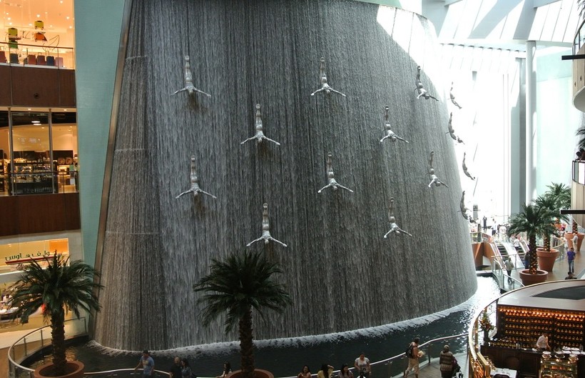 Еще одна изюминка Дубай-Молла — водопад с ныряльщиками. Вода падает через все четыре этажа здания, а водопад сам состоит из двух цилиндрических конструкций, каждая из которых достигает высоту и ширину 24 и 30 метров соответственно. Водопад украшают фигуры ныряльщиков за жемчугом, сделанными из стеклопластика, которые красиво переливаются самыми разными цветами, как при солнечном свете, так и при искусственной ночной иллюминации. Почему именно ловцы жемчуга? Это связано с историей Арабских Эмиратов. Когда в ОАЭ еще не добывали нефть, единственным источником дохода страны была добыча жемчуга в Персидском заливе.