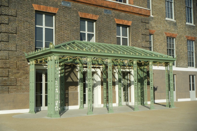 К 60-летию правления королевы к основному зданию было пристроено новое крыльцо, зеленое с золотом. По цветовой гамме оно совершенно отличается от остальной постройки. Однако благодаря своему декору конструкция довольно гармонично прилепилась к самому дворцу и подошла под стиль ажурных черно-золотистых решеток вокруг садика. Новый парадный вход теперь находится здесь.