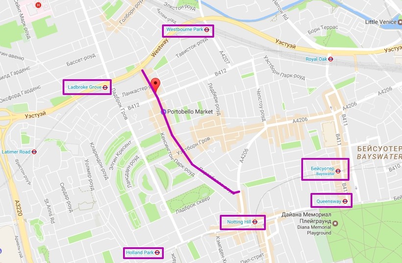 Где находится и как добраться: Рынок расположился на одноименной улице Portobello Road в районе Ноттинг-Хилл (Челси), так что добраться сюда не сложно. На карте ниже видно, что вблизи улицы расположились такие станции метро как Notting Hill, Holland Park, Landbroke Grove, Latimer Road и Bayswater, так что выбирайте наиболее удобную вам ветку метро (транспортные зоны 1-2). Из автобусных маршрутов поблизости проходят 7, 23, 27, 28, 31, 52, 70, 228, 328 и 452, однако учитывайте, что в этом районе возможны пробки, так как это один из самых центральных районов города, но старинная застройка оставляет не так много места для транспорта. Для поиска в навигации используйте индекс W10 5TA.