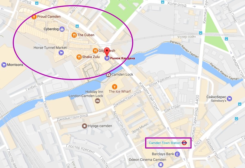 Где находится и как добраться: Рынок Кэмдена находится на улице Camden Highstreet, прямо на берегу небольшого канала. Ближайшие станция метро — Camden Town, Northern Line, а также станция пригородных поездов (overground) Camden Road. Из автобусов в шаговой доступности останавливаются 24, 27, 31, 168, 214, 274 и 393. Для поиска в навигаторе вводите следующие данные: Camden Lock Place, nw1 8af.