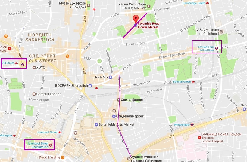Пожалуй, Columbia Road — самое очаровательное и аутентичное место в Лондоне, так что если не знаете, как провести утро воскресенье, смело отправляйтесь сюда. После же можно отправиться на расположившуюся поблизости знаменитую улицу Brick Lane, где полно уличной еды, граффити, тату-салонов, а по выходным также проходит маркет (на карте ниже обозначен тонкой линией).