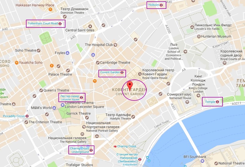 Где находится и как добраться: Covent Garden находится в сердце Лондона, среди пешеходных улочек с многочисленными пабами и ресторанами. В пешей доступности станции метро Covent Garden, Leicester Square, Charing Cross, Holborn, Temple и Tottenham Court Road, так что вы доберетесь сюда без труда из любой точки. Добираться сюда наземным транспортом будет куда менее удобно, так как на узких и часто односторонних улицах затруднено движение, а пешеходные зоны делают этот район почти недоступным для автобусов. Ближайшие остановки — у Leicester Square (автобусы 24, 29, 176) и на улице Drury Lane (автобусы 1, 59, 68, 91, 168, 171, 188 и 521). На картах вы легко найдете это место по индексу WC2E 8RF.