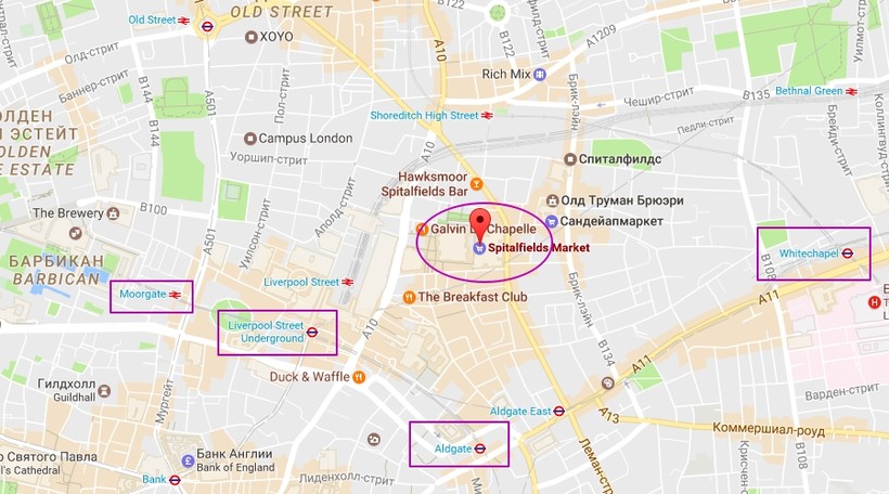 Где находится и как добраться: Здание рынка находится в паре минут ходьбы от станций метро Liverpool Street, Aldgate, Moorgate и Bank. Автобусы останавливаются на улице Bishops Gate, маршруты 8, 26, 42, 78, 135, 205, 242, 388, L1, L2 и L3. Для поиска в навигации вводите индекс E1 6EW.