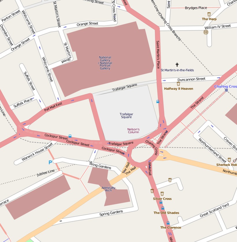 - станция Charing Cross (линии Bakerloo, Northern). Выходы из метро ведут прямо на саму площадь так, что даже и переходить никуда не надо. Хоп! И ты посредине белокаменного творения, полностью закатанного в плиты;