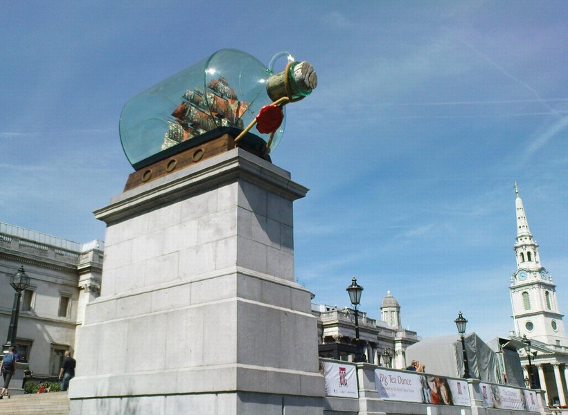 Четвертый постамент, также рассчитанный под конную статую, пустовал аж до 1999 г. В итоге его стали использовать как объект современного искусства: на нем располагают временные экспонаты. Среди них были статуя беременной женщины, родившейся без рук, синий петух и самая удачная, на мой взгляд, экспозиция — макет корабля Нельсона в огромной пластиковой бутылке. Корабль — уменьшенная копия корабля «Виктори», на котором адмирал и сложил свою голову.