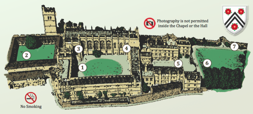 Хотя он и носит название Новый, его здание было построено еще в XIV веке, и сегодня он остается одним из ключевых образцов типичной оксфордской архитектуры. Войдя на территорию, мы оказываемся в центральном дворе, Front Quandrangle (под цифрой 1 на схеме ниже), куда выходят церковь (3), спальный и учебный корпуса, библиотека и холл (4).